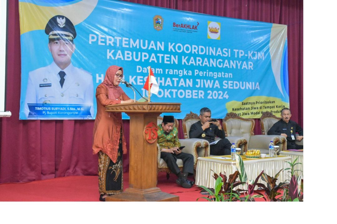 KARANGANYAR – Pj. Bupati Karanganyar Timotius Suryadi S.Sos,M.Si. menghadiri acara Pertemuan Koordinasi Tim Pelaksana Kesehatan Jiwa Masyarakat (TP – KJM) Kabupaten Karanganyar dalam rangka peringatan Hari Kesehatan Jiwa Sedunia, bertempat di Hotel Taman Sari Karanganyar pada hari Kamis, 10 Oktober 2024. Acara ini dihadiri juga oleh Kepala Dinas Sosial, Kepala Baznas Provinsi Jawa Tengah, Baznas Karanganyar, Kepala Dinas Kesehatan, Tim Pelaksana Kesehatan Jiwa Masyarakat Karanganyar, Puskesmas se-Karanganyar.