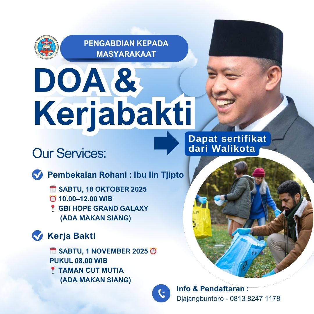 Bekasi,15 Okt 2025 – PGLII (Persekutuan Gereja-Gereja dan Lembaga-Lembaga Injili Indonesia) mengundang Anda untuk berpartisipasi dalam acara “Pengabdian kepada Masyarakat”, sebuah kesempatan berharga untuk memperkaya diri, berkontribusi nyata, dan meraih Sertifikat dari Walikota!