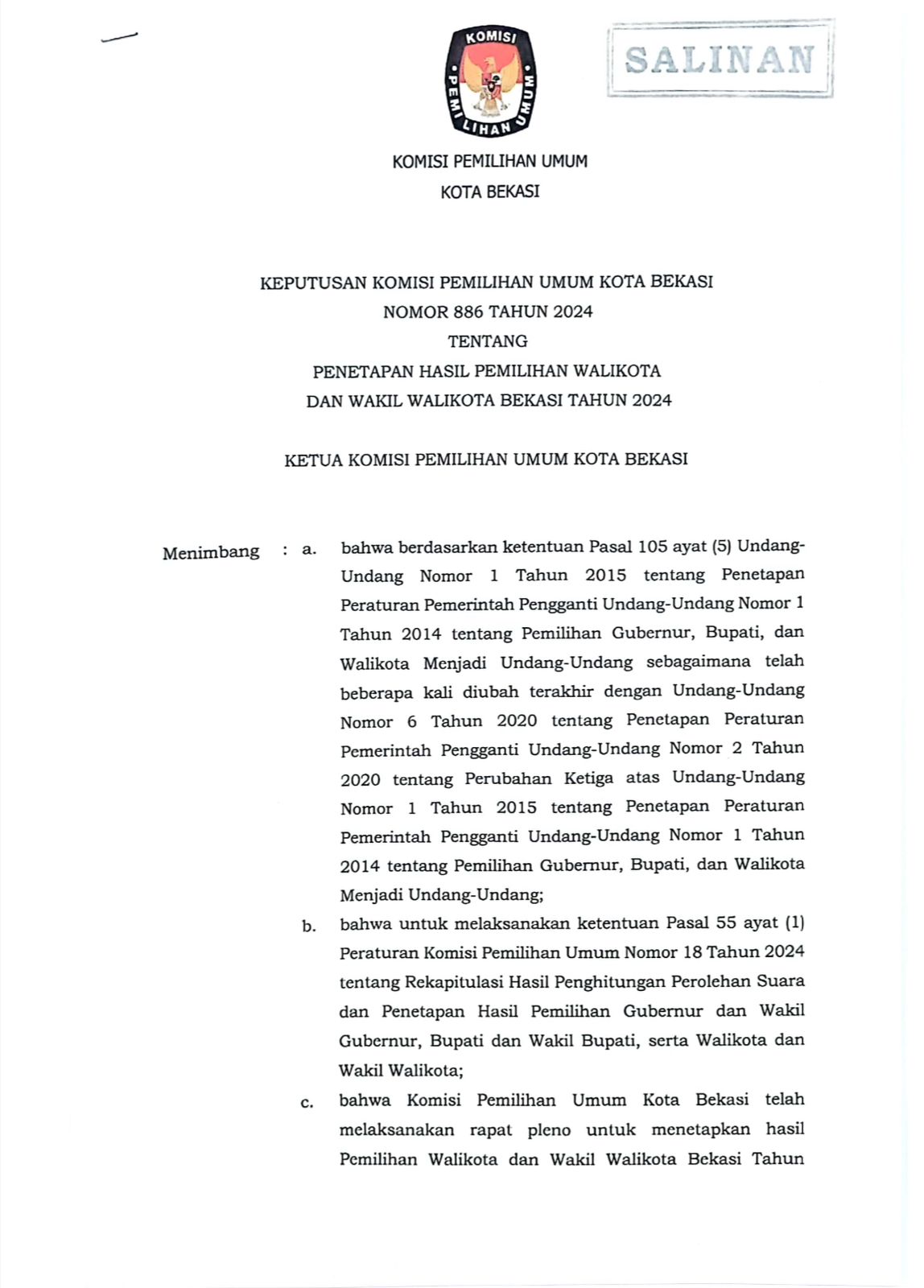 Hasil tersebut tertuang dalam Surat Keputusan (SK) Pemilihan Wali Kota Bekasi Nomor 886 Tahun 2024 yang ditandatangani oleh Ketua KPUD Kota Bekasi, Ali Syaifa. Dalam SK itu, pasangan nomor urut 3 dinyatakan sebagai pemenang resmi Pilkada Bekasi tahun ini.