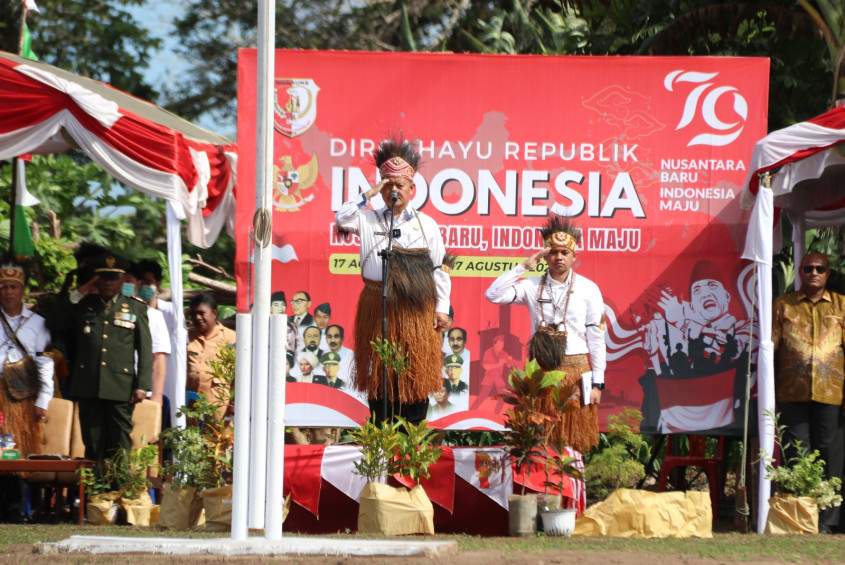 Merauke – Kepala Badan Pengembangan Sumber Daya Manusia (BPSDM) Kementerian Dalam Negeri (Kemendagri) Sugeng Hariyono menjadi inspektur upacara (Irup) peringatan Hari Ulang Tahun (HUT) ke-79 Kemerdekaan Republik Indonesia (RI) di Pos Lintas Batas Negara (PLBN) Sota, Kabupaten Merauke, Papua Selatan.
