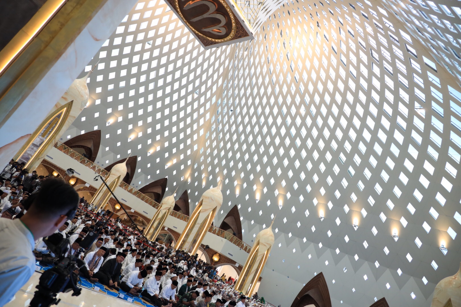 Masjid dengan biaya lebih dari Rp 1 triliun ini, dapat menampung sekitar 50 ribu jamaah dilengkapi dengan fasilitas plaza selasar ruang salat mezaninen dan ruang salat utama.