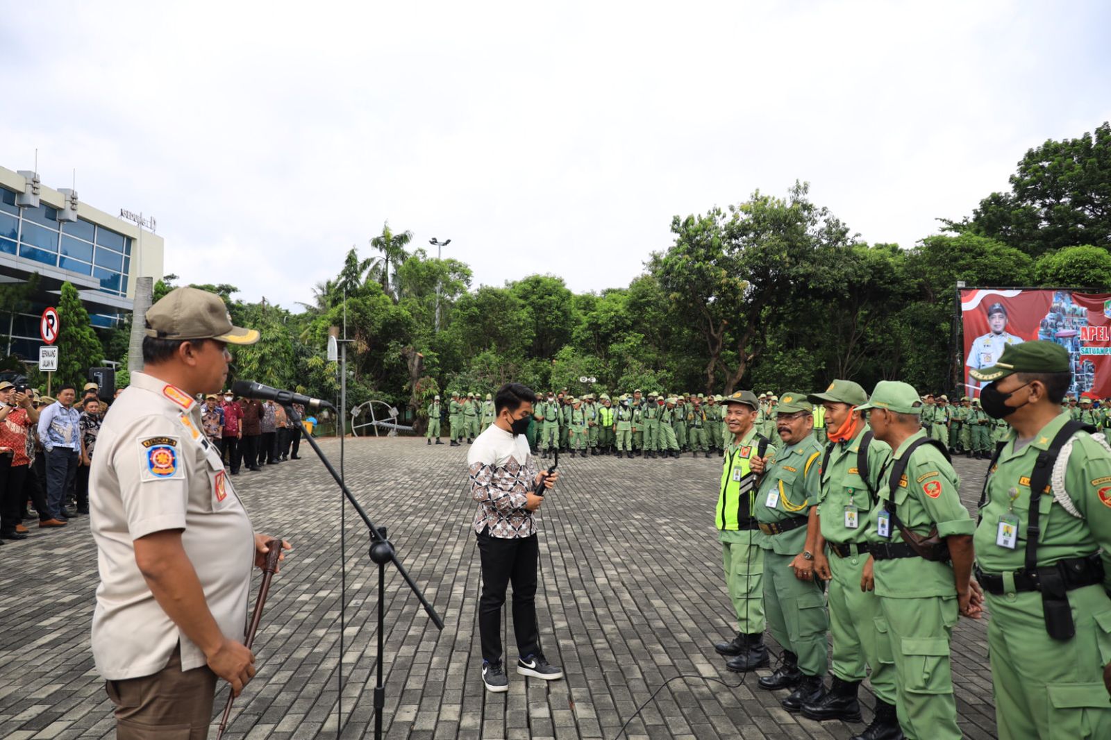 Pelaksana Tugas (Plt.) Wali Kota Bekasi, Tri Adhianto didampingi oleh Kepala Satpol PP Kota Bekasi, Karto beserta jajaran mengikuti apel akbar tersebut dengan rangkaian pemberian beras sebanyak 10 kg kepada para Anggota linmas dari masing masing Kelurahan se Kota Bekasi.