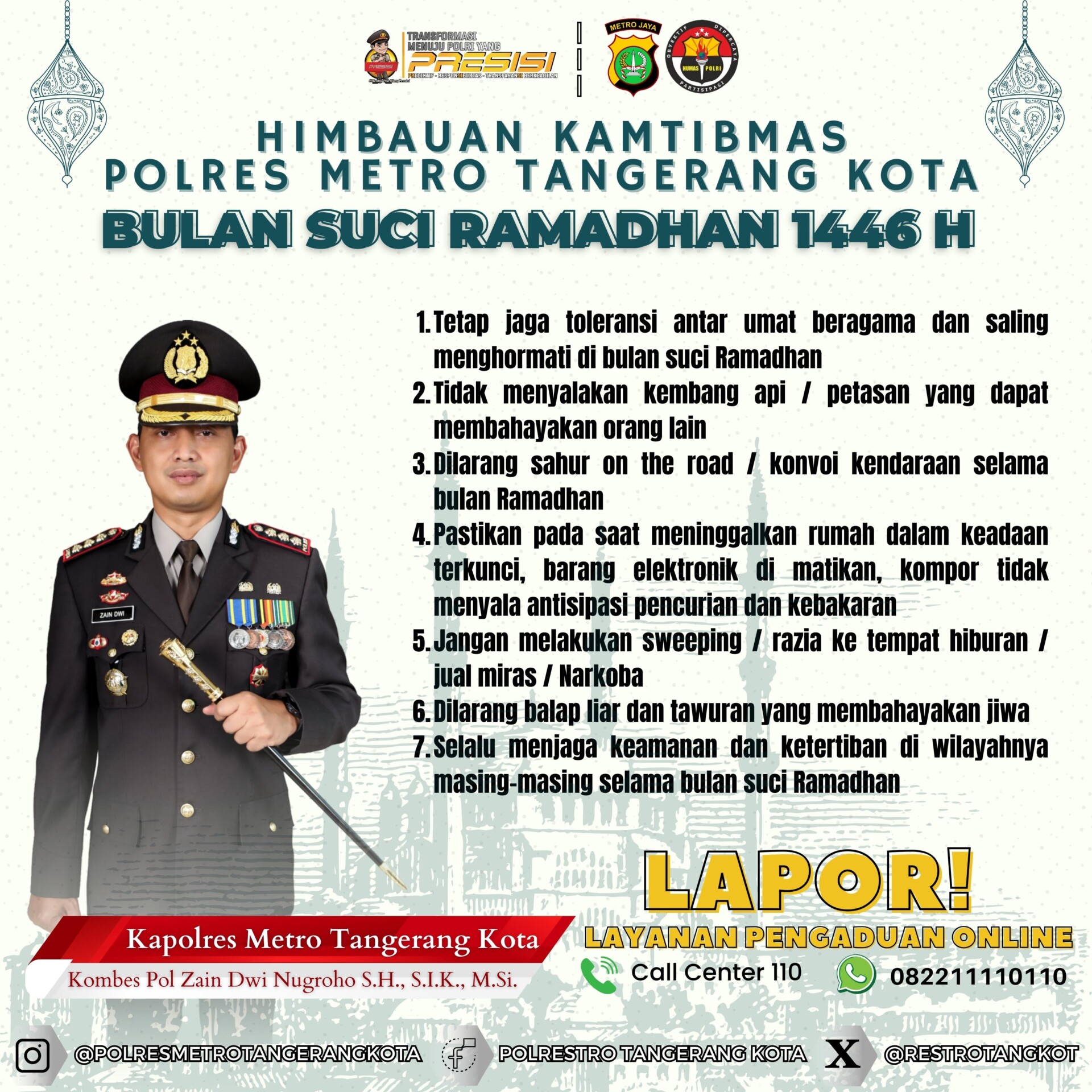 TANGERANG — Selaras dengan Pemerintah daerah (Pemda). Kapolres, KBP Zain Dwi Nugroho mengimbau masyarakat di Wilayah Hukum Polres Metro Tangerang Kota, Polda Metro Jaya, melarang segala kegiatan yang dapat mengganggu keamanan, kenyamanan dan ketertiban selama pelaksanaan ibadah bulan suci Ramadhan 1446 Hijriah/2025 Masehi.