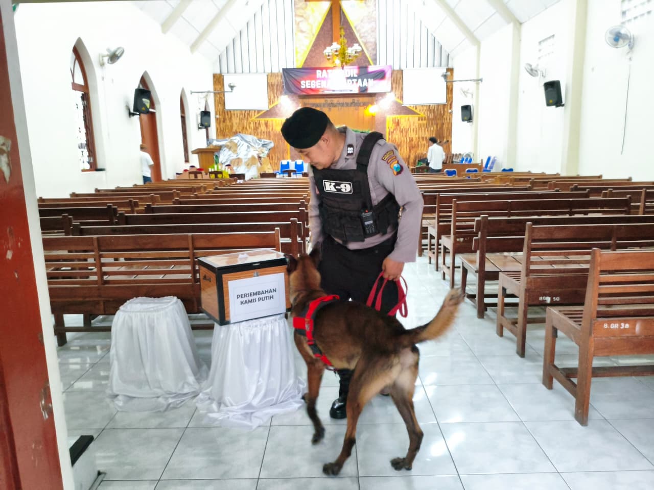 Dalam kegiatan tersebut, tim Unit Satwa K9 melakukan pemeriksaan secara menyeluruh di area gereja, mulai dari area parkir, halaman hingga bagian dalam ruang ibadah.