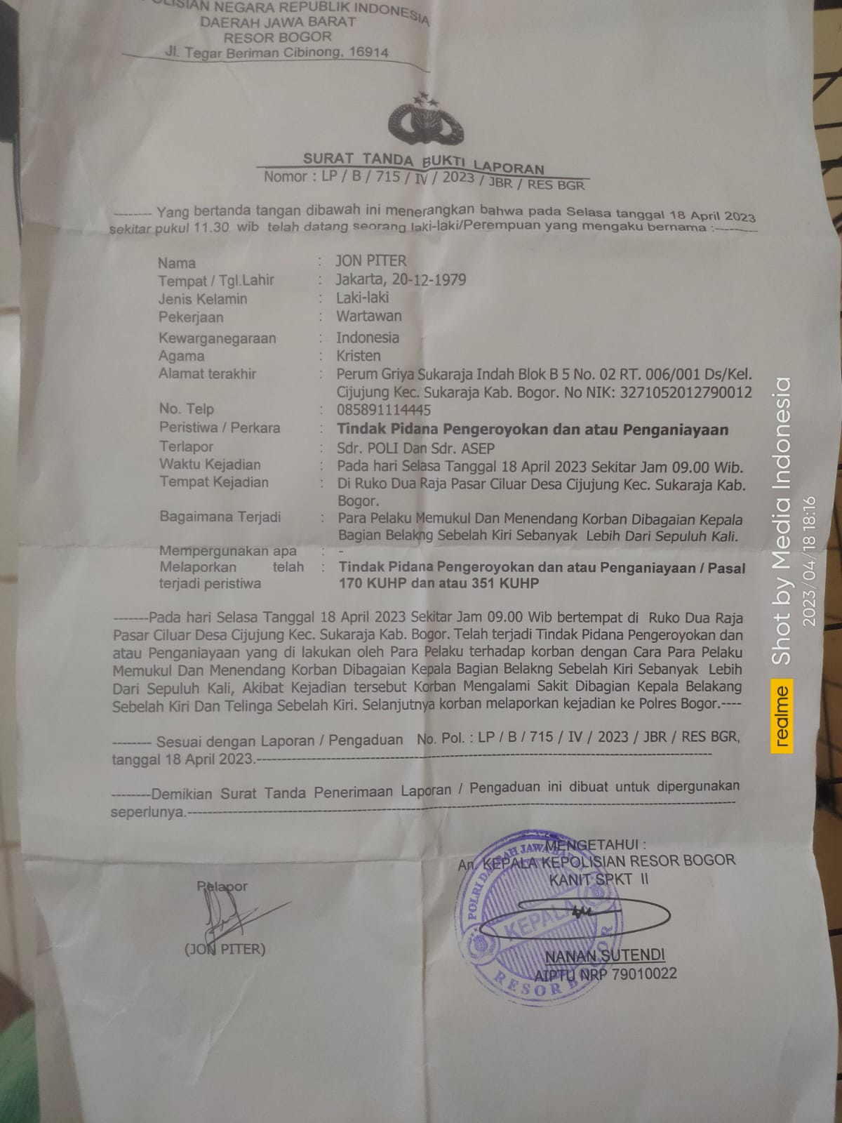 Aksi penganiayaan tersebut reda setelah datang salah satu anggota TNI dari satuan Yonkes Kedung Halang berpakaian preman melerai dan atas kejadian tersebut Jon langsung membuat LP ke Polres Bogor dengan no: LP/B/715/IV/2023/JBR/RES BGR.
