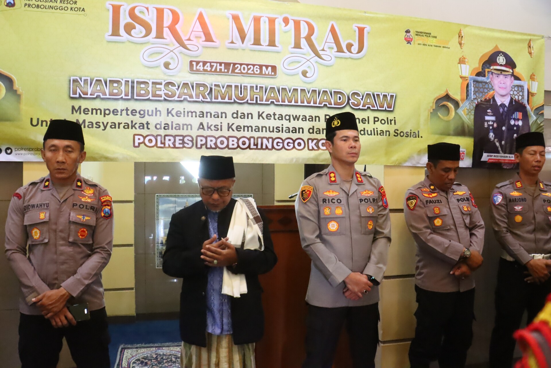 PELITAKOTA.ID: Probolinggo – Polres Probolinggo Kota menggelar kegiatan Pembinaan Rohani dan Mental (Binrohtal) rutin dalam rangka peringatan Isra Mi’raj Nabi Muhammad SAW. Kegiatan tersebut berlangsung di Masjid Amanullah Polres Probolinggo Kota, Kamis (22/1/2026) pagi.