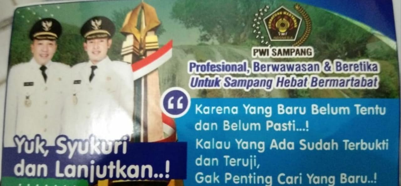 Distiker Bertuliskan “Karena Yang Baru Belum Tentu dan Belum Pasti. Kalau Yang Ada Sudah Terbukti dan Teruji, Gak Penting Cari Yang Baru. Yuk, Syukuri dan Lanjutankan!”Tulisan itu dipasang persis di samping dan di bawah foto Bupati dan Wabup.