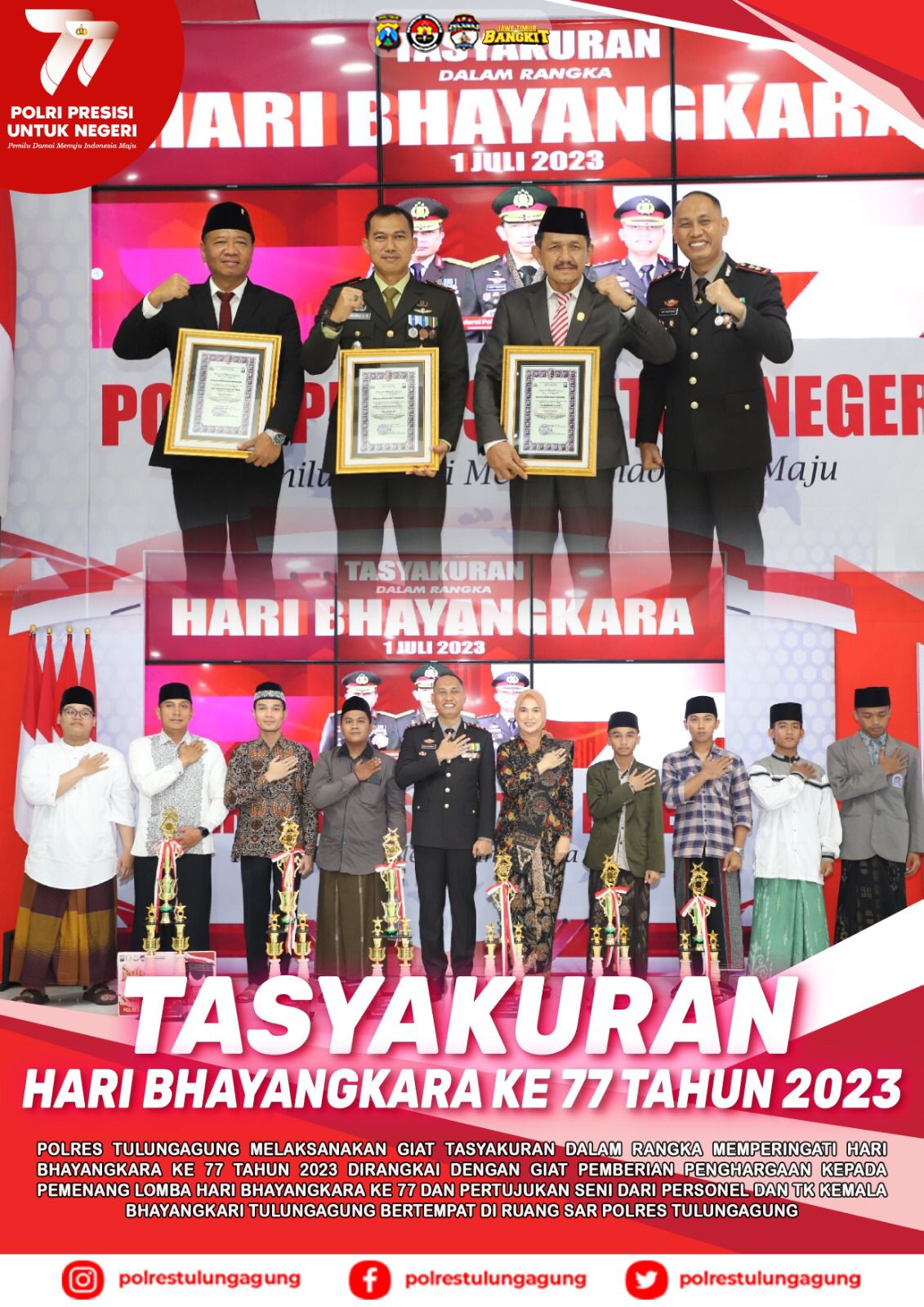 Dalam acara ini Polres Tulungagung menyerahkan piala dan piagam penghargaan bagi para pemenang lomba-lomba yang diadakan Polres Tulungagung selama menyambut Hari Bhayangkara ke-77.