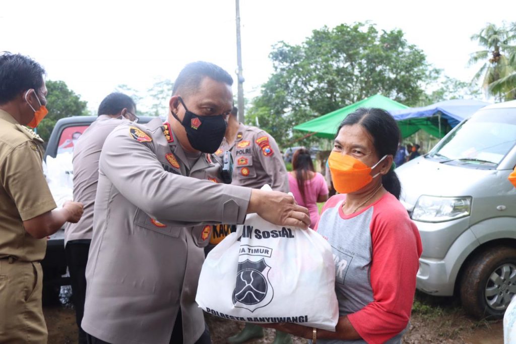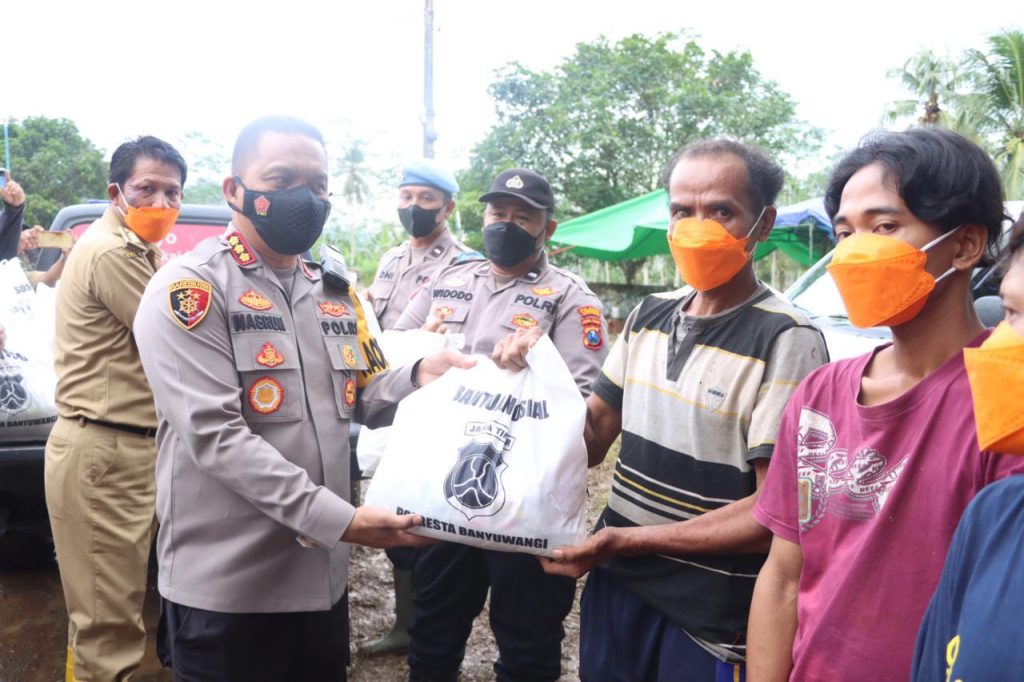 Bakti sosial kepedulian Polresta Banyuwangi terhadap korban banjir di kecamatan Pesanggara berjalan aman dan mengikuti protokol kesehatan. (Kang Bandriono)