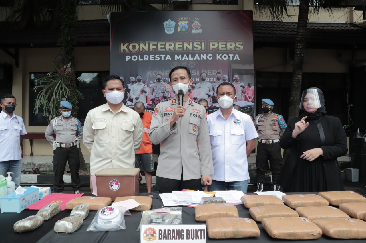 MALANG – Polresta Malang Kota berhasil mengungkap kasus penyalahgunaan narkotika jenis ganja dengam total barang bukti ganja yang berhasil di amankan seberat 14,5 KG. Hal ini di sampaikan saat pelaksanaan Konferensi Pers di halaman depan Polresta pada Rabu (9/3) pagi. Pengungkapan perkara narkotika dengan barang bukti cukup spektakuler ini berasal dari dua kasus narkoba jenis ganja yang berhasil di ungkap yakni dengan barang bukti masing-masing 3,5 kg dan 11 kg secara gamblang dipaparkan Wakapolresta Malang Kota AKBP Deny Heryanto, S.I.K., M.Si. dihadapan awak media.