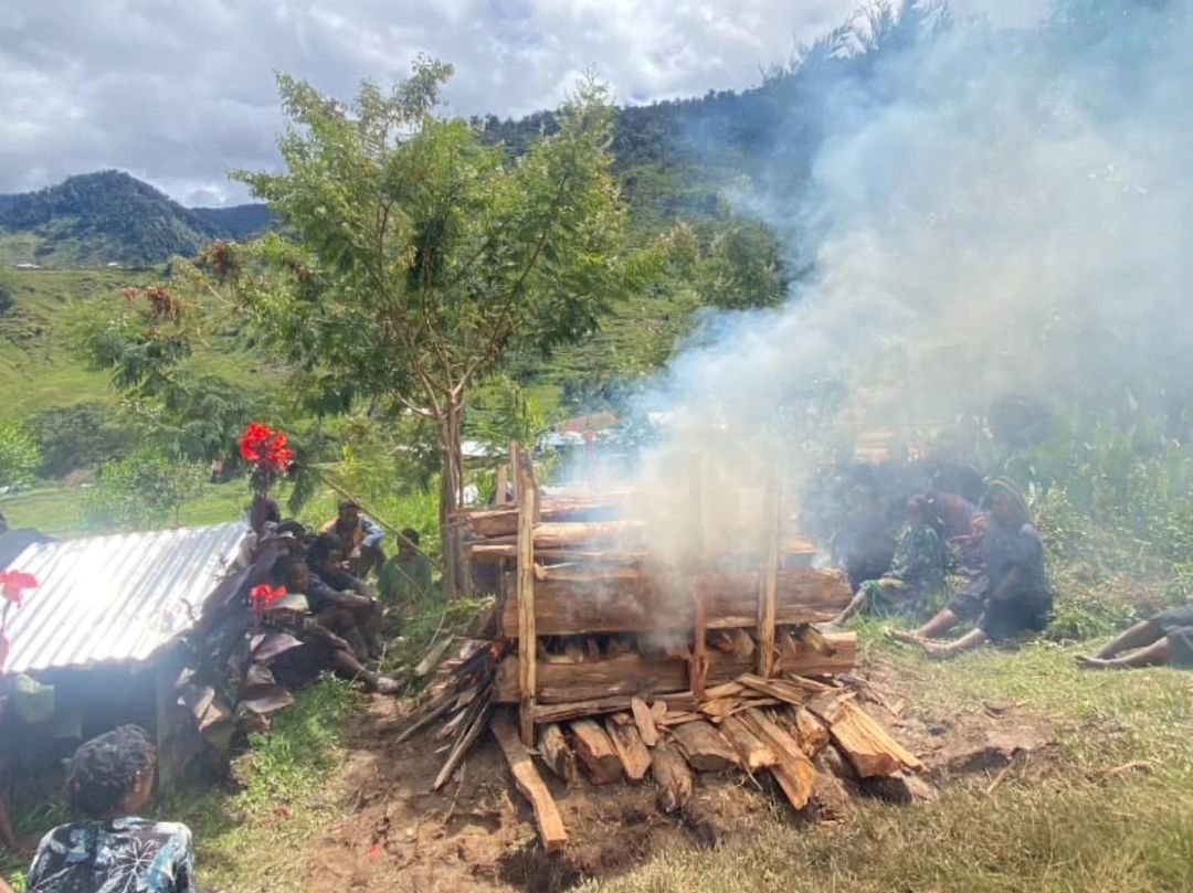 PAPUA – Pos Mbua Satgas turut membantu masyarakat dalam upacara pembakaran jenazah tokoh adat Distrik Mbua, Bapak Ishak Murib. Kamis (30/05/2024).