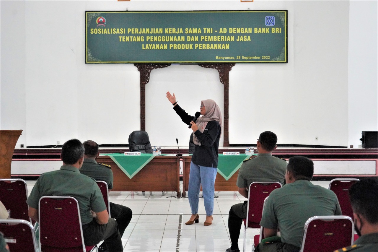Banyumas – Prajurit dan PNS Makorem 071/Wijayakusuma dan Balak Aju Kodam IV/Diponegoro jajaran Korem 071/Wijayakusuma menerima sosialisasi Perjanjian Kerja Sama antara TNI AD dengan Bank BRI, di Gedung Pertemuan A Yani Makorem 071/Wijayakusuma Sokaraja, Banyumas.