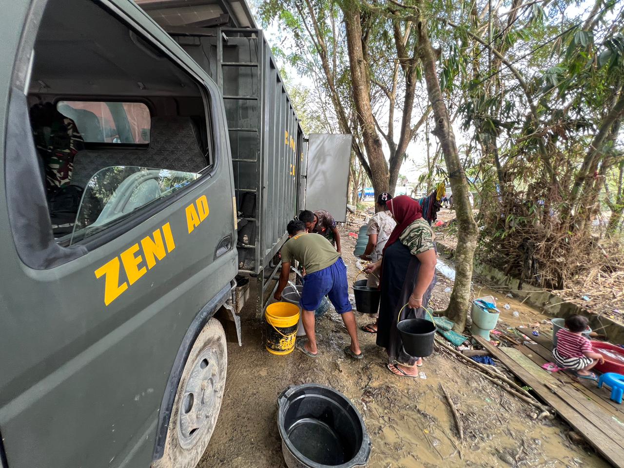 Penyaluran air bersih ini dilakukan menggunakan mobil Reverse Osmosis (RO), teknologi canggih yang memungkinkan air dari sumber lokal diolah menjadi air minum yang higienis dengan cepat dan efisien. Dengan dukungan alat zeni ini, kesulitan ketersediaan air bersih di pengungsian dapat teratasi secara signifikan.