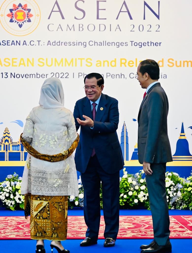 Presiden dan Ibu Iriana Jokowi tiba di Hotel Sokha sekitar pukul 7.50 waktu setempat disambut Perdana Menteri Kamboja Hun Sen dan dilanjutkan dengan sesi foto bersama.