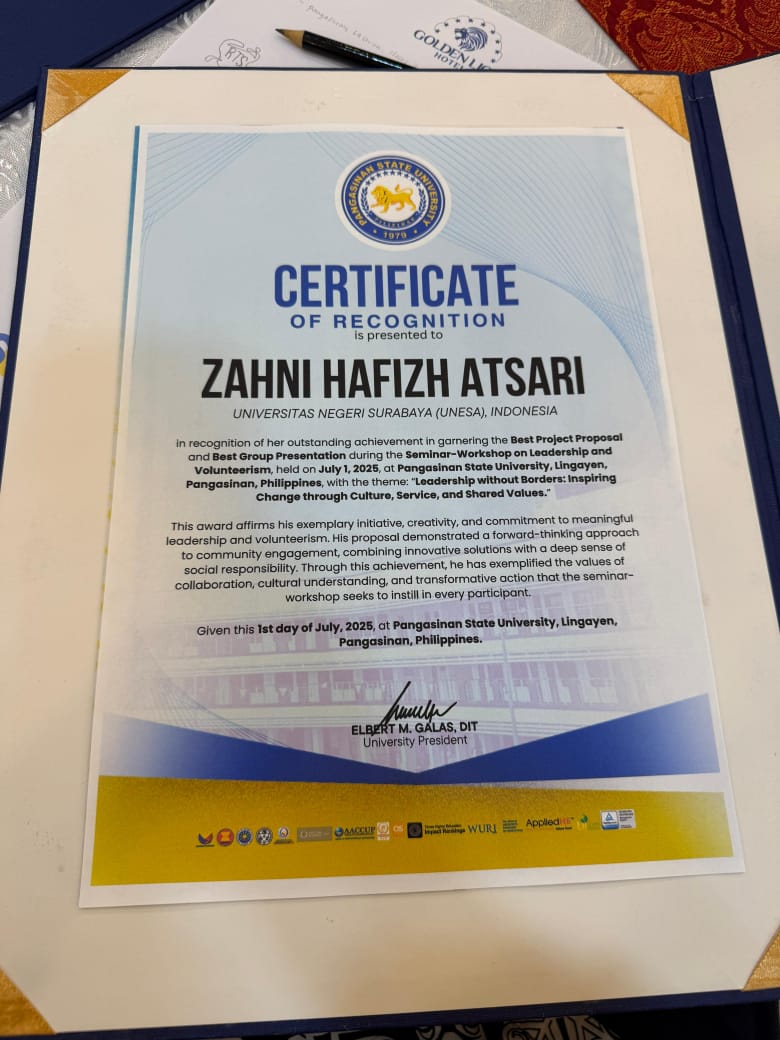 Sidoarjo – Kabar membanggakan datang dari mahasiswa Fakultas Hukum Universitas Negeri Surabaya (UNESA) asal Sidoarjo, Zahni Hafizh Atsari. Ia baru-baru ini meraih prestasi internasional dengan menjadi yang terbaik dalam ajang PSU Prime Camp yang diselenggarakan oleh Pangasinan State University, Filipina, pada tanggal 30 Juni hingga 5 Juli.