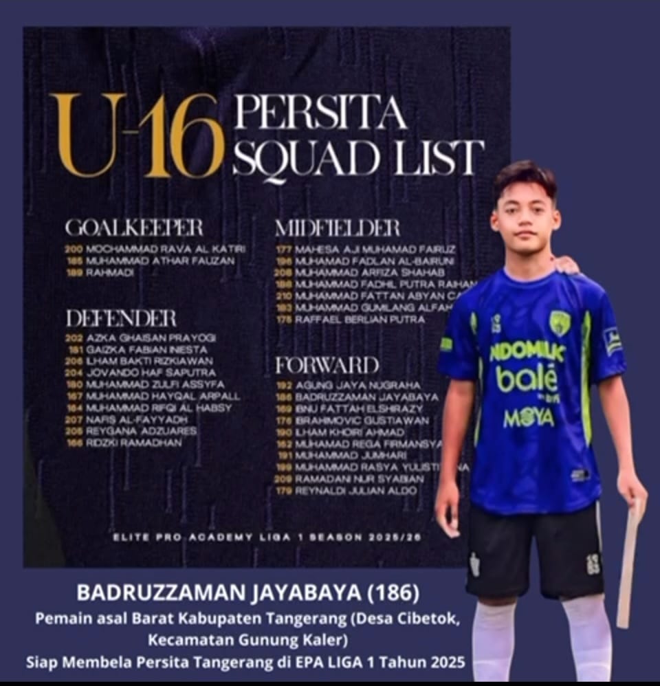 Tangerang – Kabar membanggakan datang dari dunia sepak bola muda Banten. Badruzzaman Jayabaya, pelajar kelas VIII MTsN 4 Kabupaten Tangerang asal Desa Cibetok, Kecamatan Gunung Kaler, resmi bergabung dengan Persita Tangerang U-16 untuk berlaga di kompetisi Elite Pro Academy (EPA) Liga 1 2025/2026.