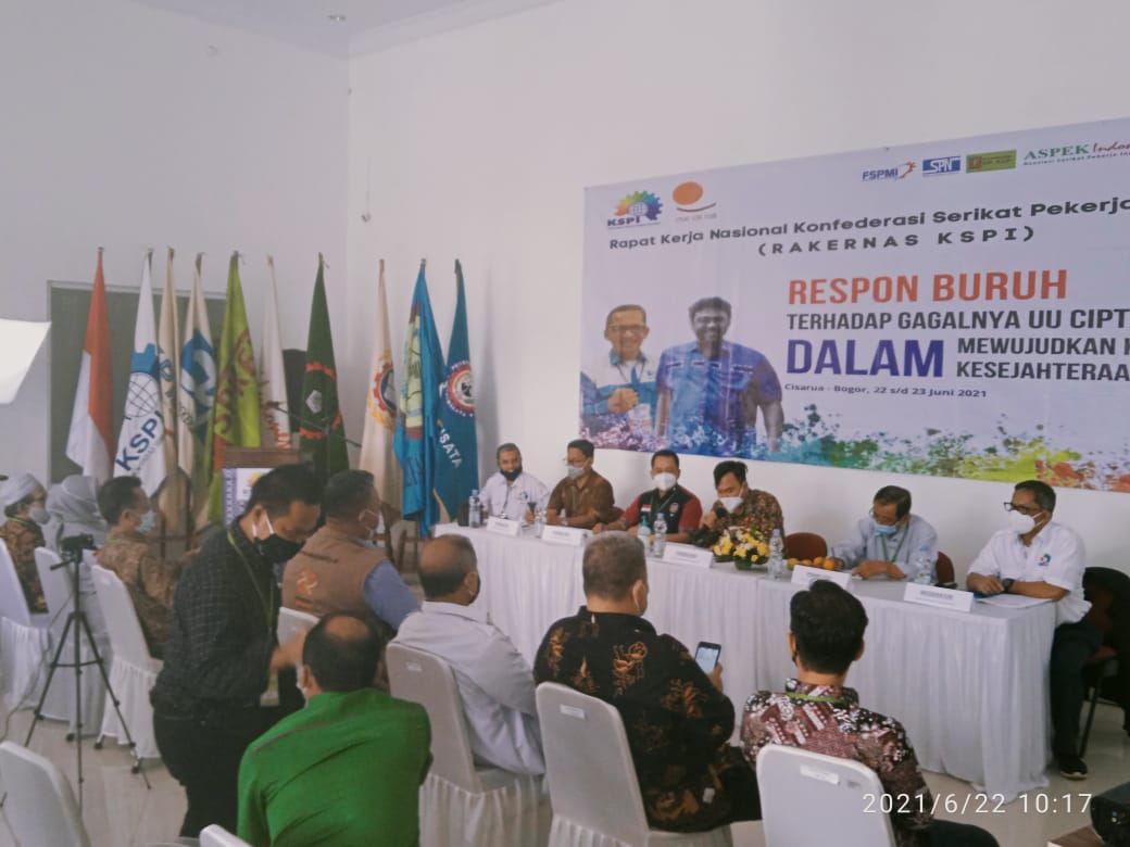 Bogor,Pelitakota.Id Konfederasi Serikat Pekerja Indonesia atau yang di Singkat KSPI laksankan Rakernas 3 bertempat di PUSDIKLAT FSPMI Cisarua Bogor dari tanggal 22 Juni – 23 Juni 2021. KSPI yang di pimpin Said Iqbal ini dalam Rakernasnya mengusung Tema “Respon Buruh terhadap gagalnya UU Cipta Kerja dalam Mewujudkan Keadilan dan Kesejahteraan Sosial”.di ikuti oleh Serika Pekerja yang tergabung didalam seperti :