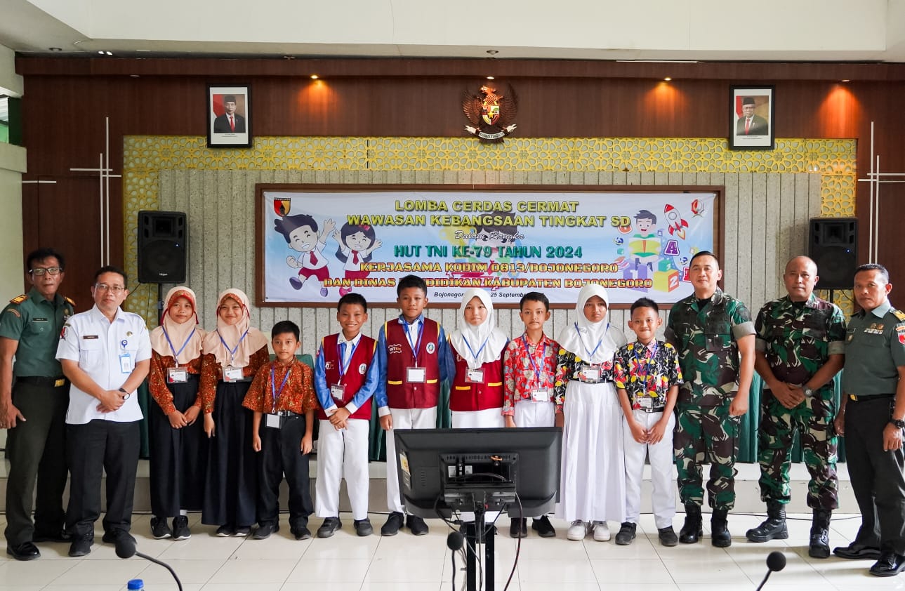 BOJONEGORO, – Riuh suara para suporter terdengar didalam Gedung Ahmad Yani Markas Kodim 0813 Bojonegoro Jawa Timur. Pasalnya, peserta yang mewakili Kecamatan Kapas keluar sebagai juara pertama dalam kegiatan Lomba Cerdas Cermat (LCC) Wawasan Kebangsaan jenjang Sekolah Dasar (SD) yang digelar oleh Kodim 0813 Bojonegoro bersinergi dengan Dinas Pendidikan setempat, Rabu (25/9/2024).
