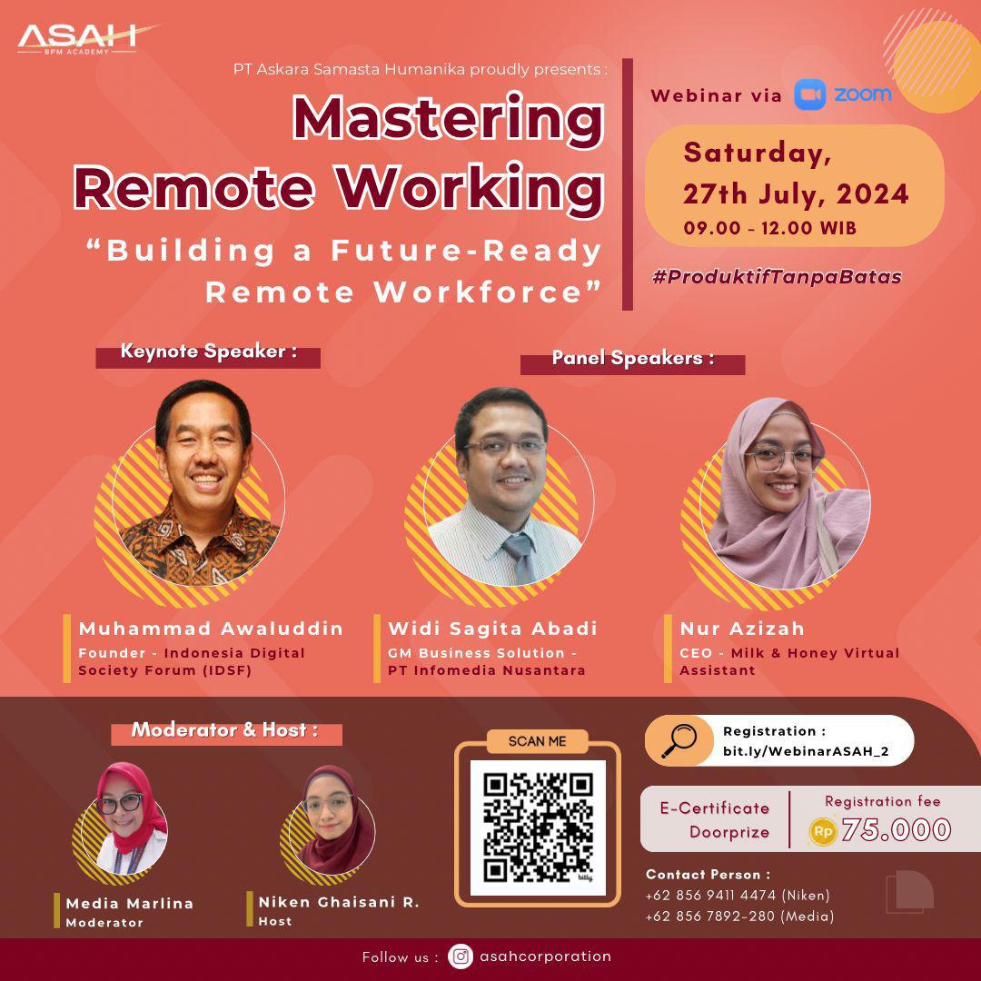 Adapun webinar Mastering Remote Working: Building a Future-Ready Remote Workforce ini digelar startup PT Askara Samasta Humanika (ASAH), perusahaan teknologi berfokus pada business process management (BPM). BPM sendiri adalah proses penyesuaian atau sinkronisasi sumber daya perusahaan agar dapat berjalan selaras untuk mencapai tujuan atau target perusahaan.