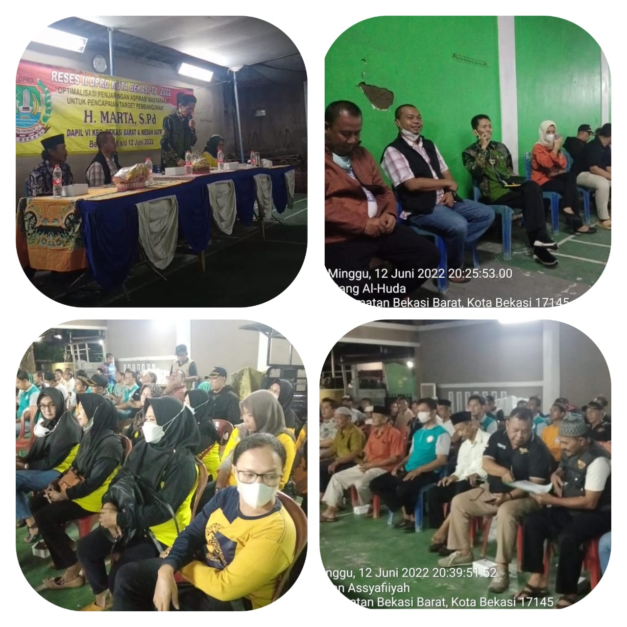 Anggota DPRD Kota Bekasi Dapil VI Kecamatan Bekasi Barat, H. Martha menggelar reses II untuk menyerap aspirasi dari masyarakat di dapilnya. Semua Aspirasi Masyarakat ditampungnya , yaitu tempat ibadah ( mussollah ) meminta Karpet, Cctv untuk dilingkungan yang rawan pencurian sepeda motor , biopori, pengadaan barang seperti tenda , bangku plastik , leptop untuk ibu-ibu Kader PKK, pos brikdapol ( untuk keamanan wilayah ) Masyarakat RW 21 sangat bahagia aspirasinya di serap oleh anggota dewanya.