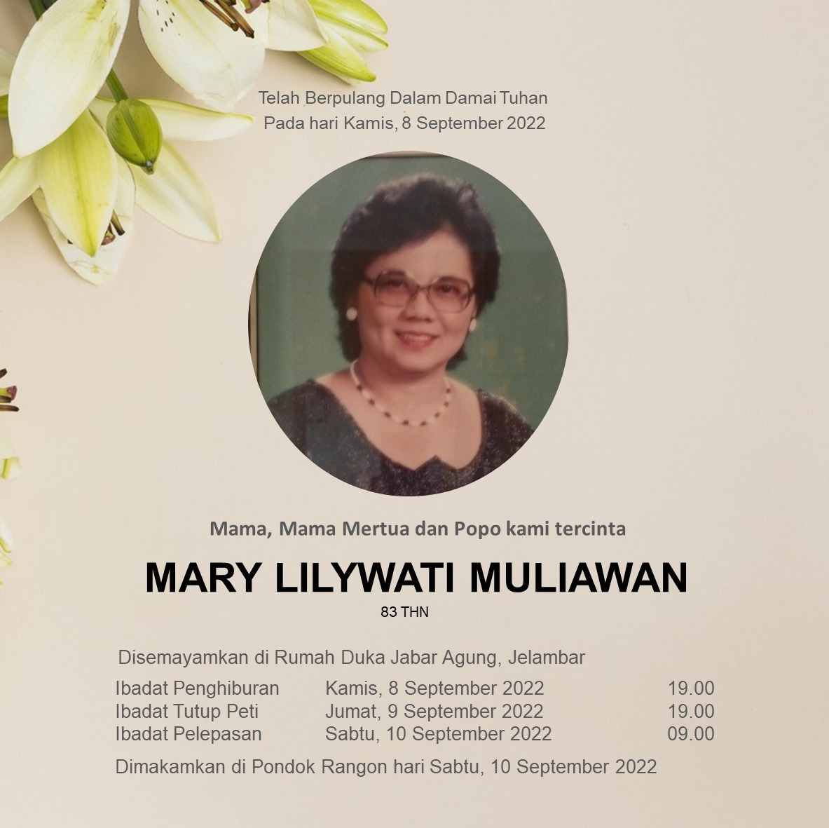 Telah kembali kepangkuan Bapak di Surga dengan damai Almarhumah Nyonya “Mary Lilywati Muliawan (83) Tahun wafat pada Kamis pukul 10.42 8 September 2022 “Almarhumah di Semayamkan di Rumah Duka Jelambar Lt Dasar Ruang Cempaka Yayasan Jabar Agung.