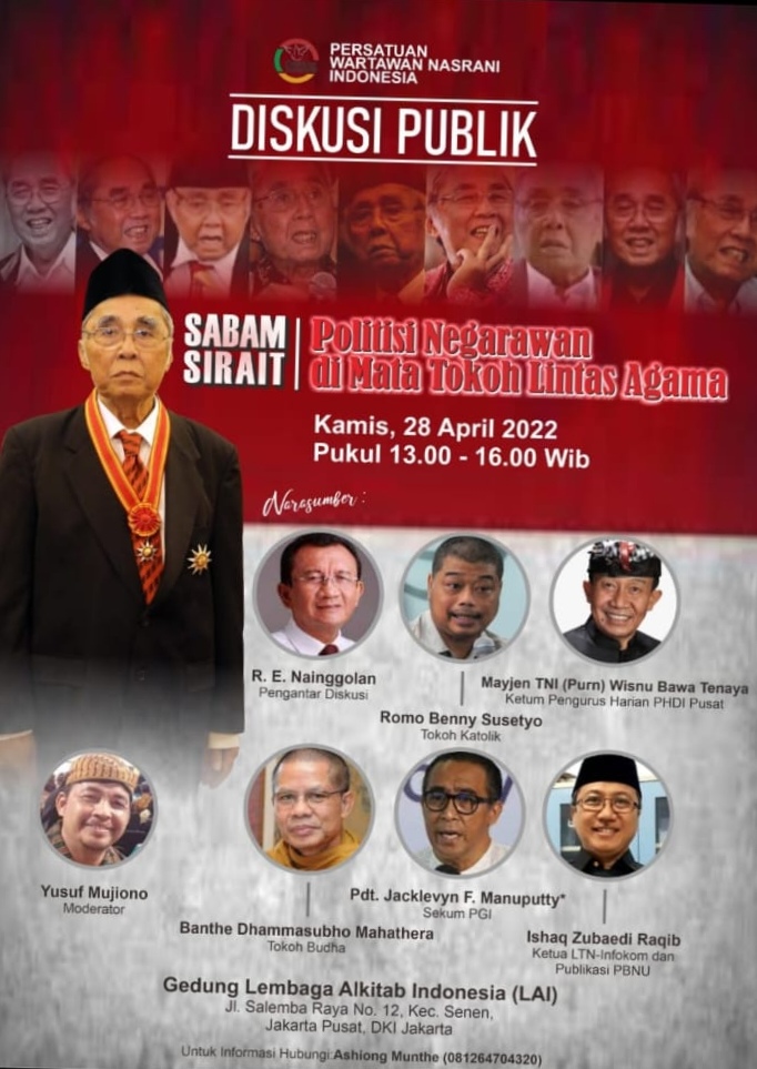 Jakarta – Untuk lebih memahami Peran dari Seorang Sabam Sirait dalam Percaturan Politik Nasional dan Rekam Jejak yang sudah ditinggalkannya, maka Persatuan Wartawan Nasrani Indonesia (PEWARNA) menggelar Diskusi Publik dengan tema Sabam Sirait Politisi Negarawan di Mata Tokoh Lintas Agama, dengan menampilkan pemateri antara lain Dr. RE Nainggolan (Ketua Pengusul Sabam Sirait Pahlawan Nasional), Romo Benny Susetyo (KWI), Mayjen Purn. TNI (Purn) Wisnu Bawa Tenaya (Ketua Umum Pengurus PHDI), Pdt. Jacklevyn F. Manuputty (Sekretaris Umum PGI) Banthe Dammasubho Mahatera (Tokoh Budha) dan Ishag Zubaedi Raqib (Ketua LKN Infokom dan Publikasi PB NU) bertempat di Gedung LAI Jakarta, Kamis (28/04/2022).
