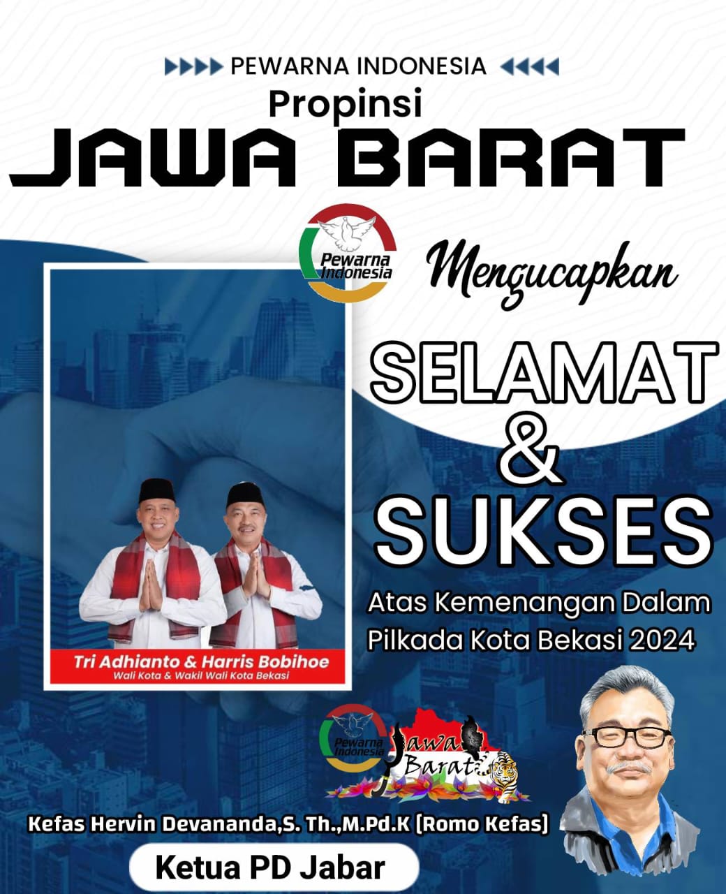 Dalam kesempatan tersebut Ketua Pewarna Indonesia Propinsi Jabar Kefas Hervin Devananda.S.Th, M.PdK mengatakan Puji syukur kepada Tuhan bahwa pasangan Tri – Harris berhasil memenangi Pilkada kota Bekasi dengan perolehan 459.430 suara,ujar Pria yang disapa Romo Kefas saat diwawancara oleh awak media di RM Sudirman Galaxi Bekasi,Senen [02/11/2024]