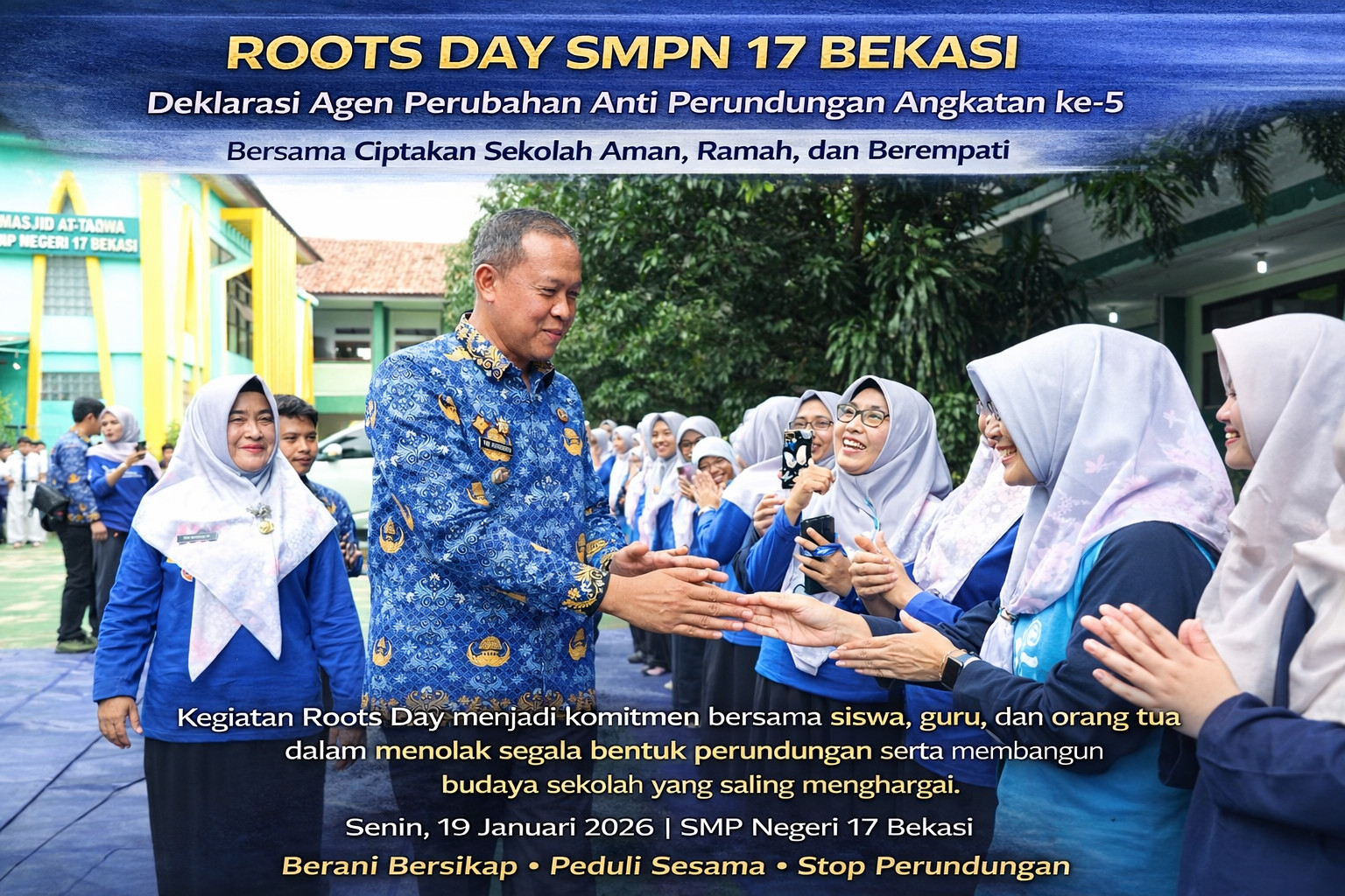 KOTA BEKASI — Suasana berbeda terasa di SMP Negeri 17 Bekasi pada Senin (19/1/2026). Bukan sekadar kegiatan seremonial, Roots Day Deklarasi Agen Perubahan Anti Perundungan Angkatan ke-5 menjelma menjadi panggung keberanian para pelajar untuk bersuara: menolak perundungan dan membangun sekolah yang aman serta berempati.