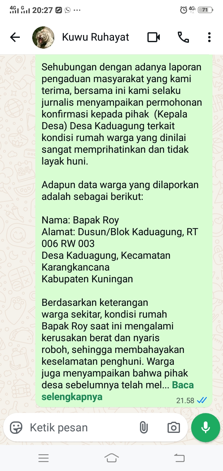 Sebagai bagian dari kerja jurnalistik profesional dan berimbang, awak media telah mengirimkan permohonan konfirmasi resmi kepada Kepala Desa Kaduagung melalui pesan WhatsApp pada Senin (19/01/2025).