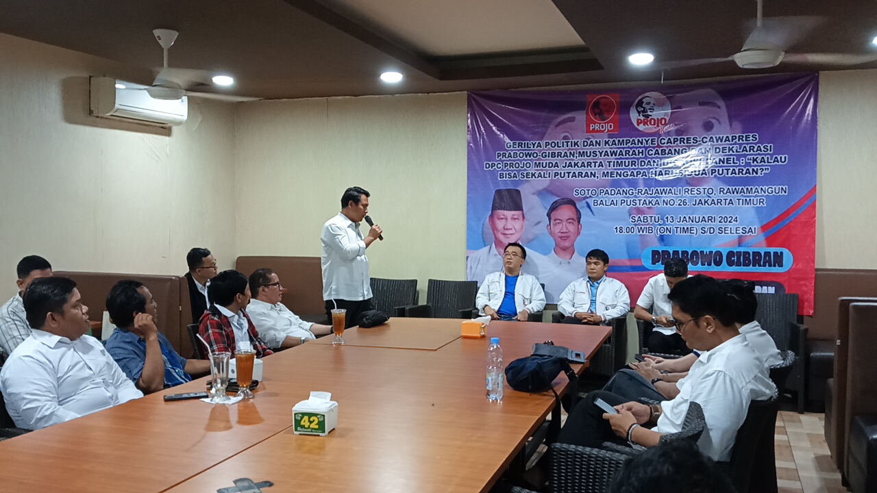 Acara Musyawarah Cabang dan Deklarasi DPC Projo muda Jakarta Timur yang dikemas dengan Diskusi Panel yang bertajuk GERILYA POLITIK “Kalau bisa SEKALI putaran, mengapa harus dua putaran?” dihadiri oleh Ketua umum Yudi Aryesta Candra didampingi waketum projo muda dr. Carlo Lumbangaol dan pengurus DPP Projo Muda lainnya serta di hadiri lebih kurang 20 Orang kader – kader Projo muda jakarta Timur.