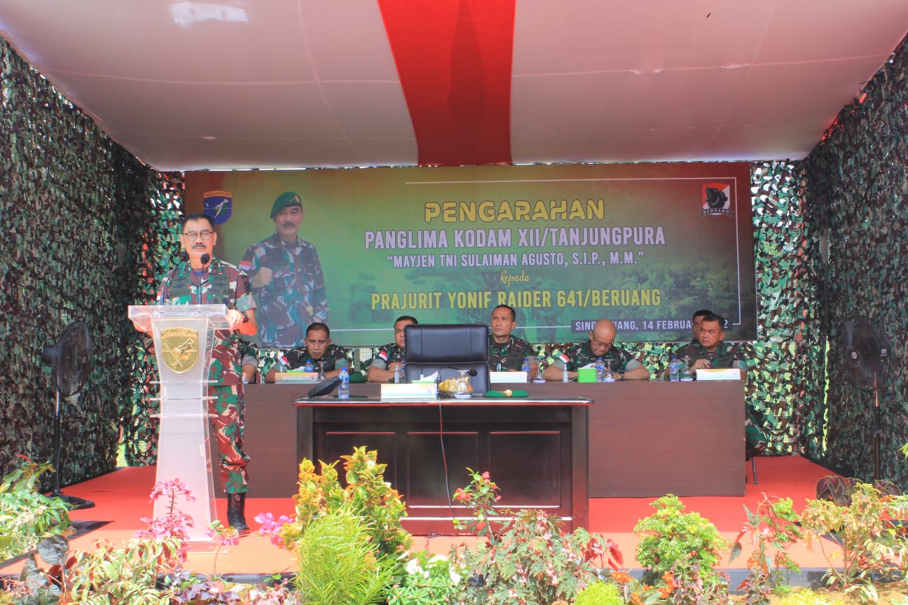 Singkawang, Senin (14/2/22) – Dalam rangka pembinaan satuan jajaran, Panglima Kodam XII/Tanjungpura Mayjen TNI Sulaiman Agusto, S.I.P., M.M., didampingi Ketua Persit Kartika Chandra Kirana Daerah XII/Tpr, Ny. Helly Sulaiman Agusto menyambangi Batalyon Infanteri (Yonif) Raider 641/Beruang, Kota Singkawang.