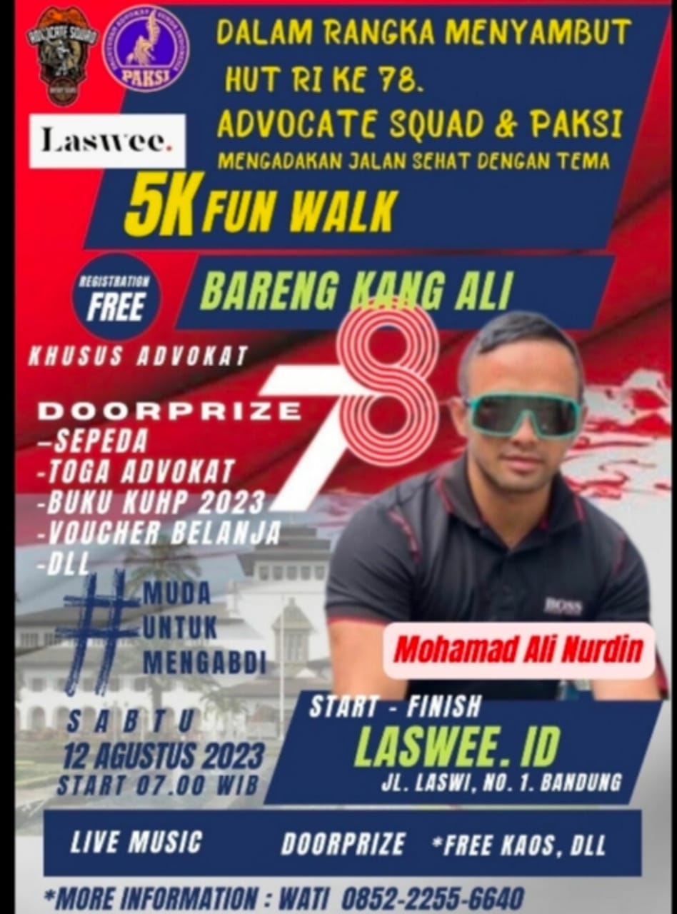 Bandung – pelitakota.id Dalam rangka menyambut dan memeriahkan hari kemerdekaan RI yang akan di peringati pada tanggal 17 Agustus 2023, Advocate Squad yang saat ini di pimpin oleh Mohamad Ali Nurdin yang akrab di sapa kang ALI akan menggelar acara jalan santai dengan tema “SEHAT DAN MERDEKA 5 K FUN WALK Bareng Kang ALI.