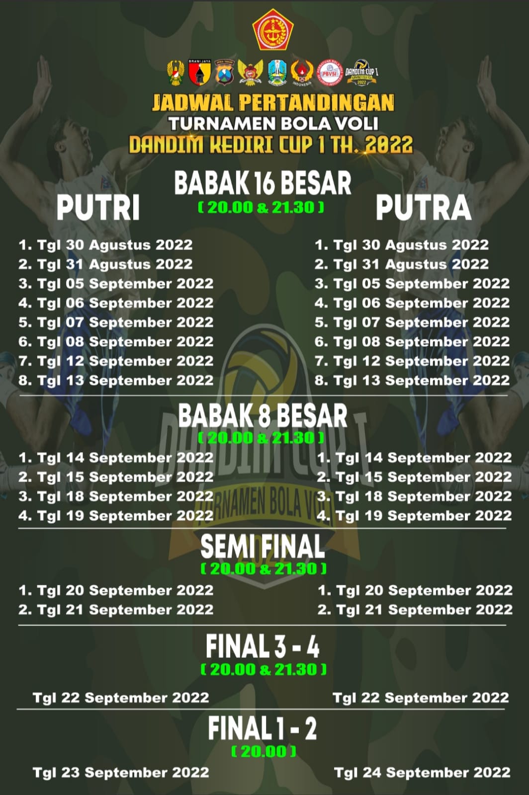 KEDIRI,- Kodim 0809/Kediri bekerjasama dengan KONI dan PBVSI Kediri menggelar open turnamen bola voli putra – putri piala Dandim Kediri Cup I Tahun 2022 dalam rangka memperingati HUT TNI Ke – 77 tahun 2022 yang dilaksanakan tanggal 30 Agustus s/d 24 September 2022 bertempat di GOR Joyoboyo Kel Bandar Kidul Kec. Mojoroto Kota Kediri mulai pukul 20.00 Wib – Selesai.