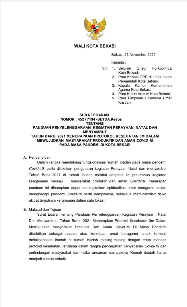 Pemerintah Kota Bekasi menghimbau kepada seluruh Kepala Perangkat Daerah, Persekutuan Gereja Indonesia, Tokoh Masyarakat, Pimpinan Umat Kristiani, Organisasi Masyarakat dan seluruh element masyarakat di Kota Bekasi untuk membantu pelaksanaan monitoring dan pengawasan penanganan penyebaran Corona Virus Disease 2019 (Covid-19) dalam Adaptasi Tatanan Hidup Baru Masyarakat Produktif Aman Covid – 19 pada wilayah rawan terdampak, secara masif kepada masyarakat Kota Bekasi khusunya pada saat kegiatan perayaan Natal dan menyambut Tahun Baru 2021.