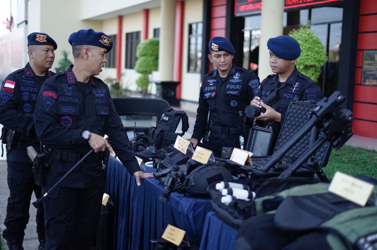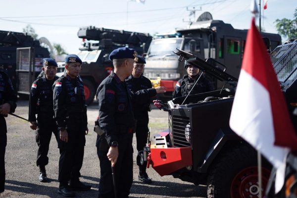 Dansatbrimob Polda Kalbar Kombes Pol. Muhammad Guntur , S.I.K., M.H. mengecek satu persatu almatsus dan kendaraan dinas yang dimiliki Satbrimob Polda Kalbar serta menanyakan seberapa jauh pengetahuan personel tentang cara penggunaan serta perawatan almatsus dan kendaraan dinas yang dimiliki oleh Satbrimob Polda Kalbar.