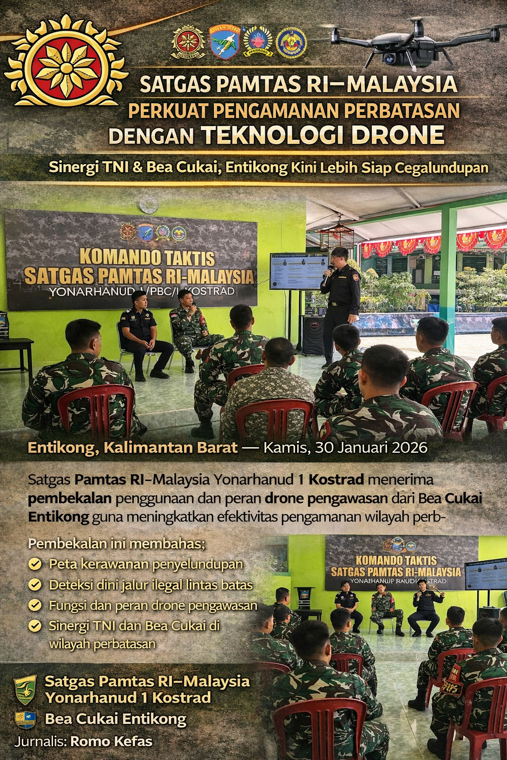 Entikong, Kalbar — Upaya menjaga perbatasan negara terus beradaptasi dengan teknologi. Satgas Pamtas RI–Malaysia Yonarhanud 1 Kostrad kini dibekali pemahaman penggunaan drone pengawasan oleh Bea Cukai Entikong, Kamis (30/1/2026), sebagai langkah memperkuat pengamanan wilayah rawan penyelundupan.