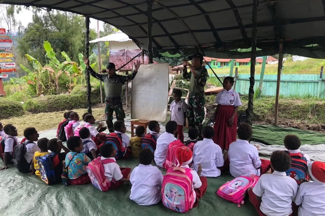 Setelah insiden kebakaran yang merusak bangunan sekolah, anak-anak di Homeyo terpaksa melaksanakan kegiatan belajar mengajar di tenda yang didirikan oleh Satgaster Yonif 754.