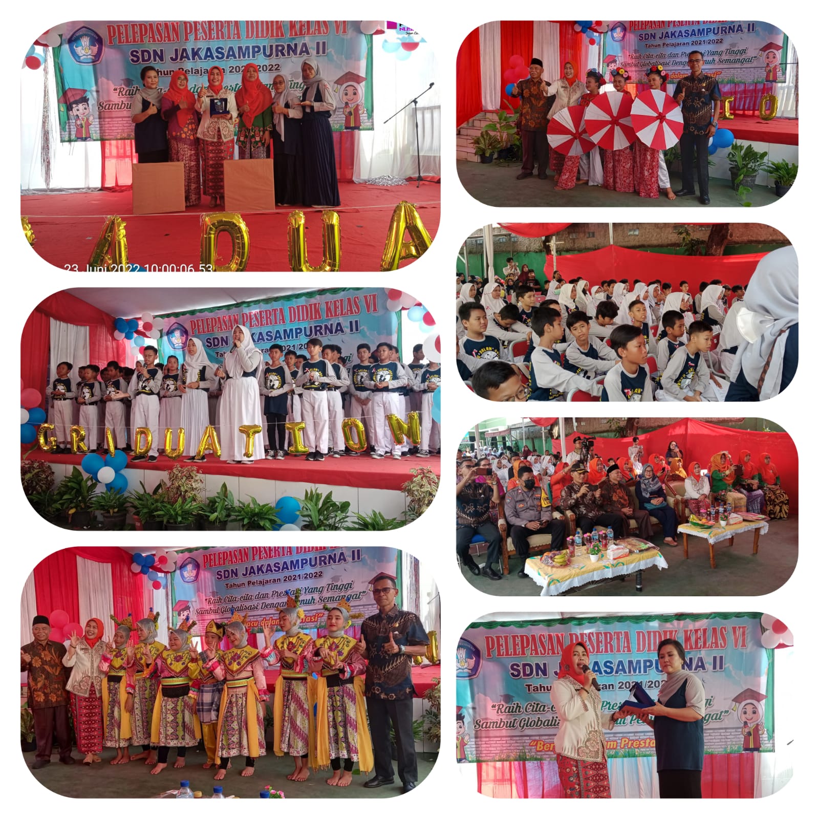 Acara perpisahan SDN Jakasampurna II Kecamatan Bekasi Barat dihadiri oleh Kepala Sekolah Maisaroh, para guru , Bimaspol Sulis , ketua RW 02 ,ketua RT , ketua komite sekolah, Kepala sekolah Jakasampurna XI, Para orang tua murid pada Hari Kamis 23 Juni 2022 Jam 08 : 00 wib sampai jam 12 : 00 wib, di halaman sekolah.