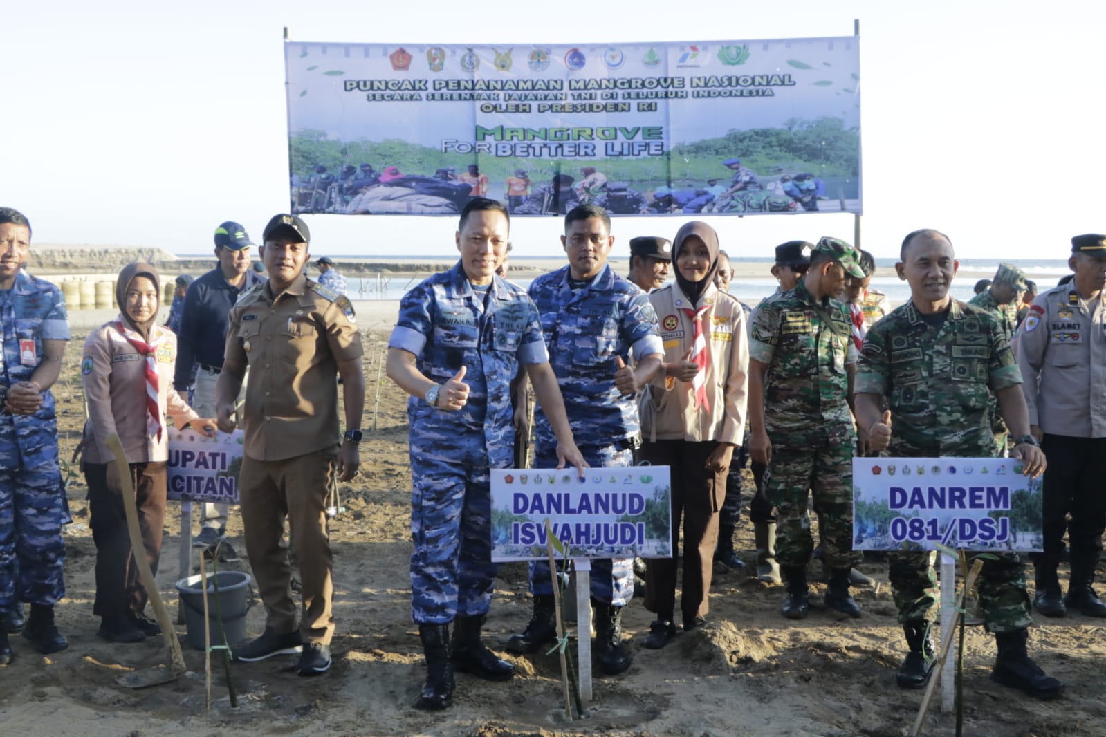 Pacitan – pelitakota.id Bertempat di Pantai Soge Pacitan Jawa Timur, Komandan Lanud Iswahjudi Marsekal Pertama TNI Irwan Pramuda, S.E., M.M., Danrem Madiun 081 DSJ, Kolonel Inf H. Sugiyono, S.Sos., Bupati Pacitan Bpk. Indrata Bayu Nur Aji, S.S., melaksanakan penanaman Mangrove nasional secara serentak oleh jajaran TNI diseluruh Indonesia tahun 2023, Senin (15/5).
