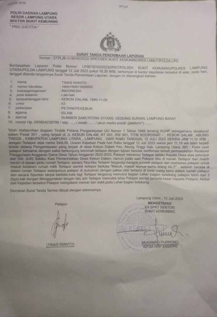 saudara Tinas Rianto mengaku telah di maki maki, di pukul pada bagian leher dan punggung oleh kepala desa dan istrinya. Hal ini terjadi pada saat saudara Tinas Rianto sedang menjalankan tugasnya sebagai jurnalistik. Saudara Tinas Rianto yang merupakan Kepala Perwakilan (kaperwil) Media Suararakyat21.com Provinsi Lampung yang juga sebagai Anggota pada Lembaga Bantuan Hukum Bintang Sembilan Nusantara ini langsung bergegas membuat laporan polisi di Kepolisian Sektor Bukit Kemuning.