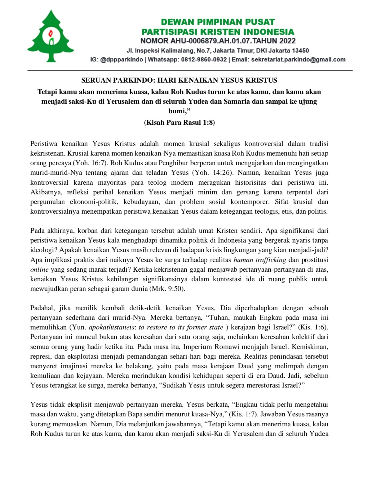 Berkenaan dengan hari kenaikan Yesus dalam konteks krisis multidimensi ini, Parisipasi Kristen Indonesia (PARKINDO) menyerukan kita harus segera melakukan pemulihan atau restorasi. Kenaikan Tuhan Yesus mengingatkan kita bahwa tanggung jawab pemulihan bukan terletak di pundak pemerintah semata. Dunia juga tidak akan lebih baik dengan duduk berpangku tangan dan berdoa sambil menanti kedatangan Sang Mesias kembali. Sebagai umat Kristen sekaligus warga negara, kita harus berpartisipasi aktif guna mengentaskan krisis multidimensi ini. Tanpa aksi nyata, restorasi hanya angan-angan belaka.