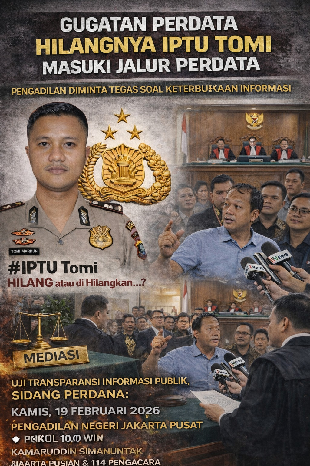 Jakarta – Proses hukum atas gugatan warga negara (Citizen Lawsuit) terkait hilangnya Iptu Tomi Samuel Marbun memasuki tahapan awal di Pengadilan Negeri Jakarta Pusat. Sidang perdana yang dijadwalkan Kamis, 19 Februari 2026 akan menjadi penentu apakah perkara tersebut dapat dilanjutkan ke tahap pemeriksaan substansi.