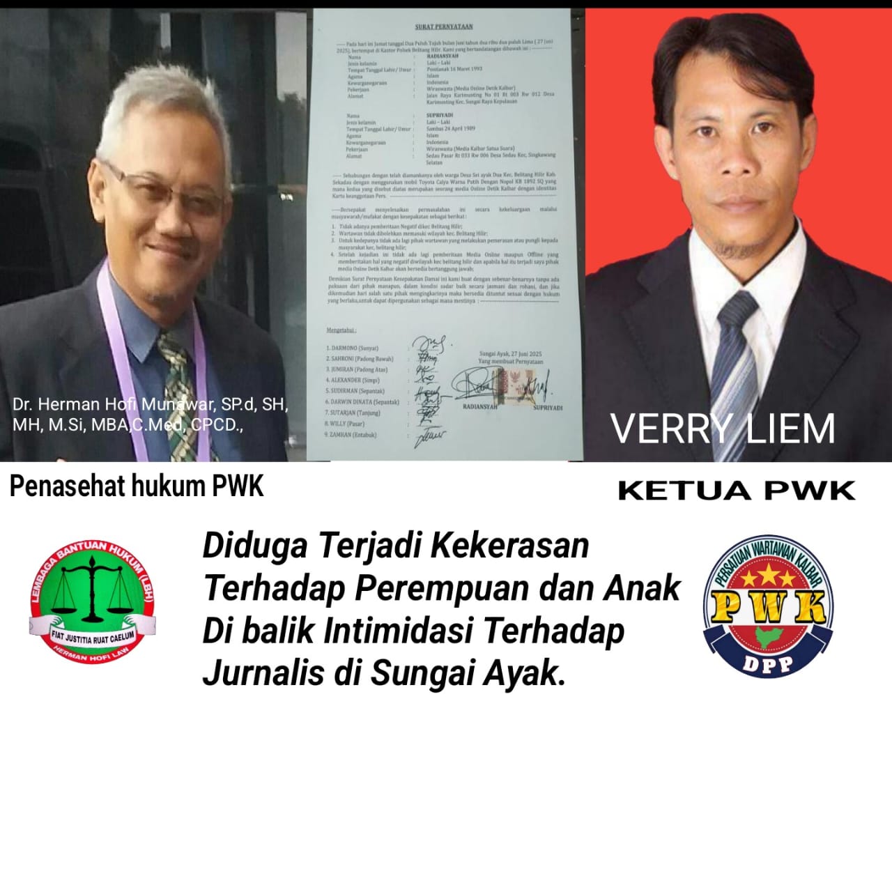 PWK mendesak aparat penegak hukum untuk segera mengusut tindak kriminal intimidasi terhadap jurnalis dan dugaan kekerasan terhadap perempuan dan anak. “Kita tidak bisa membiarkan kekerasan terhadap perempuan dan anak terus-menerus terjadi di masyarakat,” kata Verry Liem. Ia berharap bahwa pihak kepolisian dapat menunjukkan komitmen dalam penegakan hukum dan melindungi hak-hak perempuan dan anak di Kalimantan Barat berdasarkan Undang-Undang Nomor 40 Tahun 1999 tentang Pers, Peraturan Dewan Pers Nomor 5 Tahun 2008 tentang Standar Perlindungan Profesi Wartawan, dan Undang-Undang Nomor 23 Tahun 2004 tentang Penghapusan Kekerasan dalam Rumah Tangga.