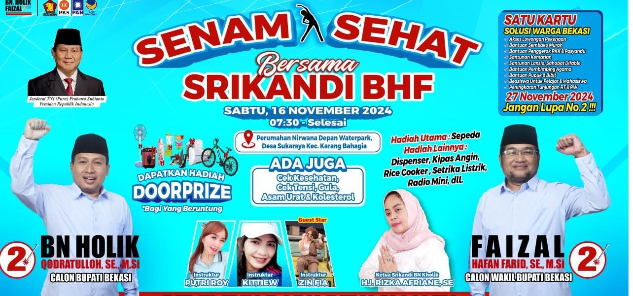 Kabupaten Bekasi – Dalam rangka mendukung pasangan calon Bupati dan Wakil Bupati BN Holik – Faizal (BHF) di Kabupaten Bekasi, Srikandi BHF akan menggelar acara senam sehat gratis yang dijadwalkan akan dihadiri lebih dari 3000 orang dari berbagai kalangan dan usia.