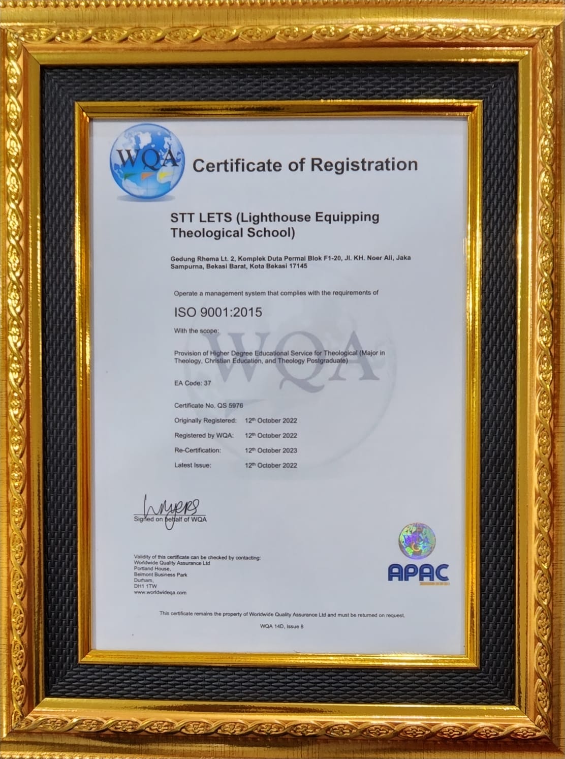 Bekasi, Selasa 14/2 – PK NEWS STT LETS (Lighthouse Equipping Theological School) mendapat Sertifikat ISO 9001:2015 dari badan sertifikasi Internasional Worldwide Quality Assurance (WQA) UK Limited. Sertifikat manajemen mutu berdasarkan standar Organisasi Standardisasi Internasional (The International Organization for Standardization/ ISO), sejak 2023 dan setelah ini setiap tahun diaudit oleh WQA.