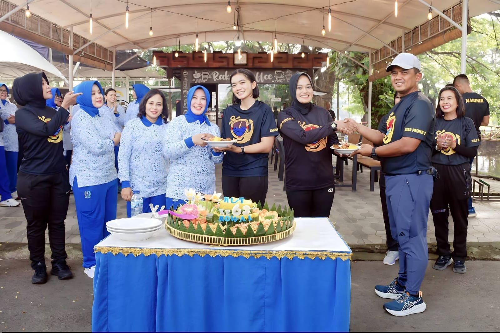 Dispen Kormar, TNI AL (Sidoarjo). Dengan penuh semangat dan suasana keakraban, Komandan Pasmar 2 Mayjen TNI (Mar) Dr. Oni Juniato didampingi Ketua Korcab Pasmar 2 Gabungan Jalasenastri Korps Marinir Ny. Dian Oni Junianto, memberikan surprise kepada para srikandi laut Pasmar 2 berupa pemotongan tumpeng memperingati HUT ke 63 Kowal di Raksa Coffee Kesatrian Marinir Moekijat, Mako Pasmar 2 Gedangan, Sidoarjo. Kamis (08/01)