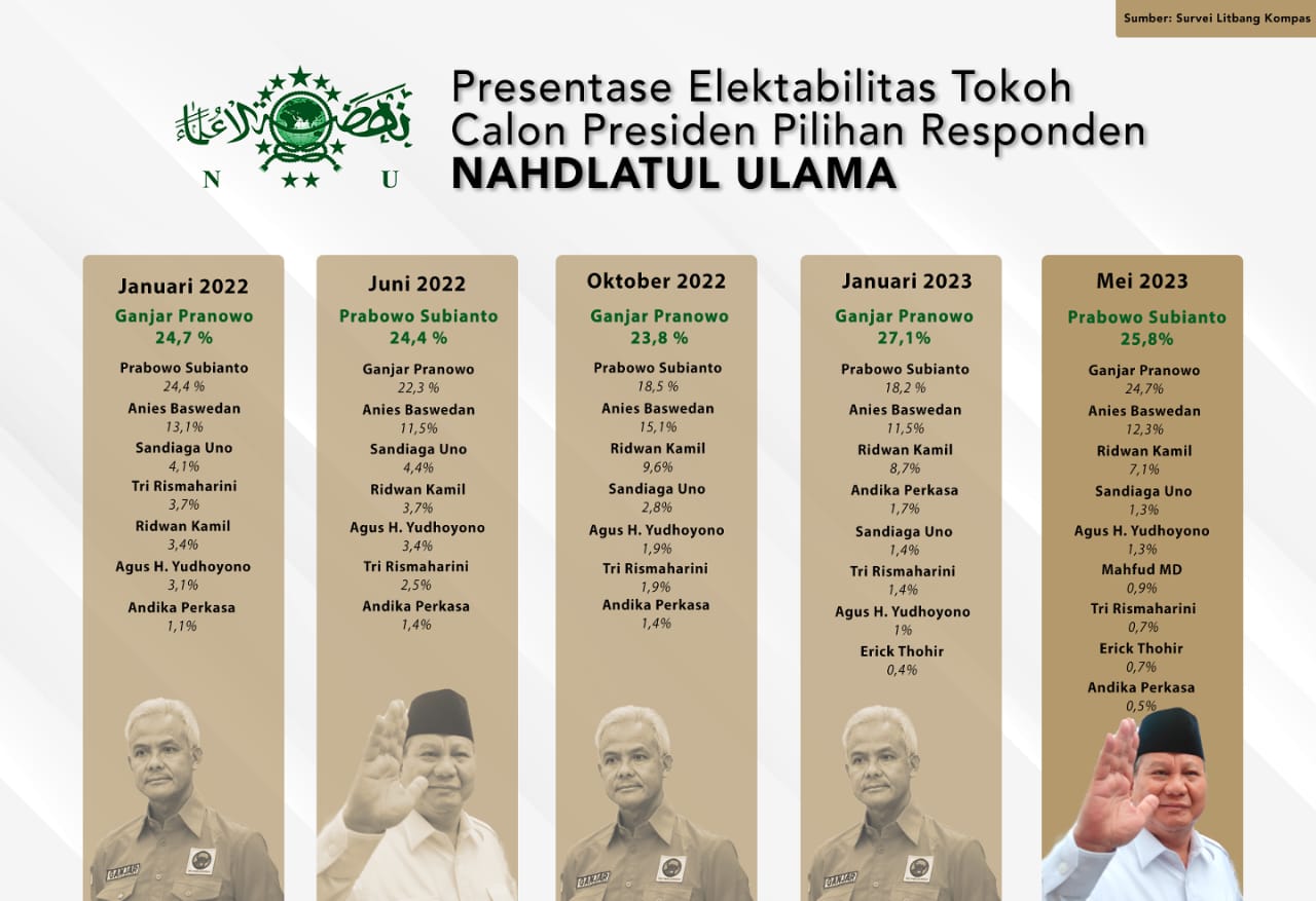Merujuk hasil survei Litbang Kompas Mei 2023, elektabilitas Prabowo di kalangan Nahdliyin mencapai 25,8 persen. Naik sekitar 7 persen dari hasil survei pada Januari 2023.