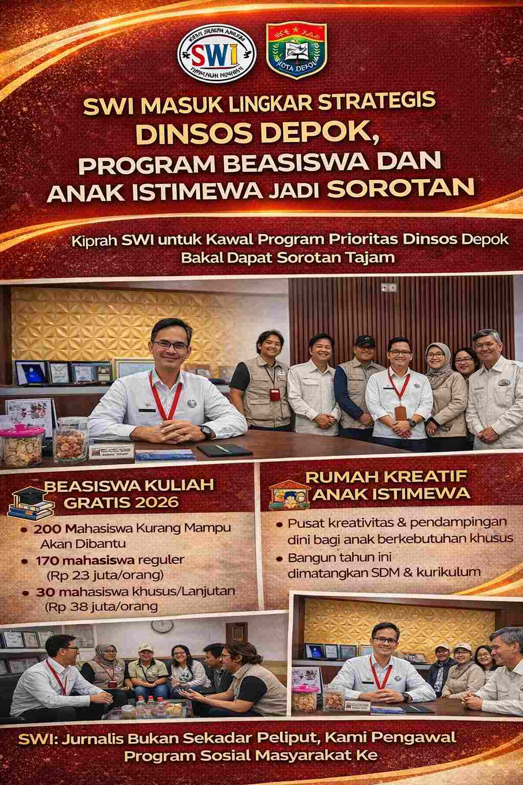 Dalam audiensi itu, Dinsos Depok memaparkan dua program prioritas yang menjadi perhatian publik, yakni Rumah Kreatif Anak Istimewa (RKAI) dan Beasiswa Kuliah Gratis bagi warga kurang mampu. SWI diposisikan sebagai mitra strategis dalam menyosialisasikan sekaligus mengawasi agar program tersebut tepat sasaran.