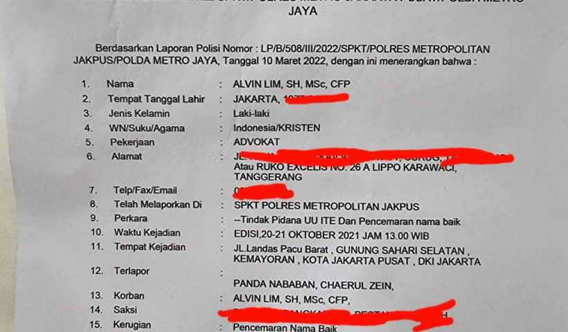 Jakarta – Majalah Keadilan dipolisikan atas dugaan pencemaran nama baik dan fitnah, oleh Ketua Pengurus LQ Indonesia Lawfirm, Advokat Alvin Lim, SH, MSc, CFP, CLA…