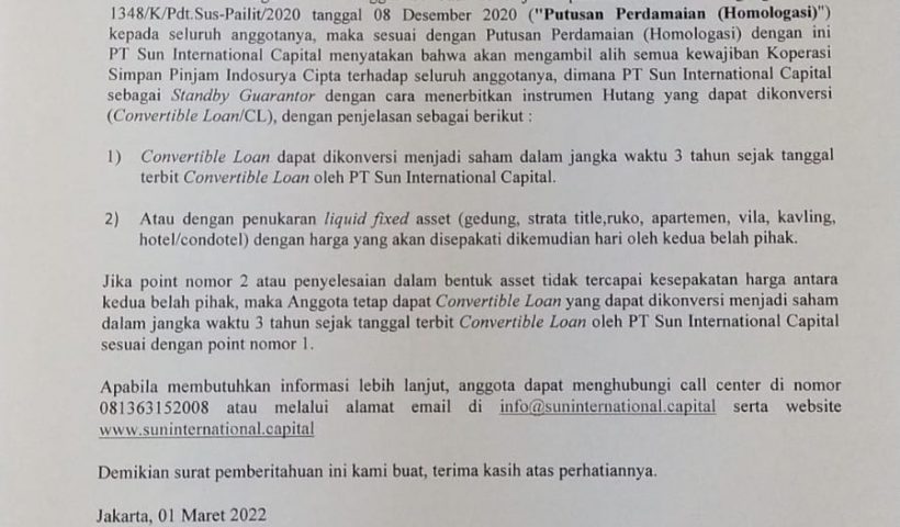 Jakarta – Beberapa hari ini mayoritas korban Indosurya menerima surat dari PT Sun Capital Indonesia, yang pertama berisi surat pengantar dan kedua berisi surat Convertible…